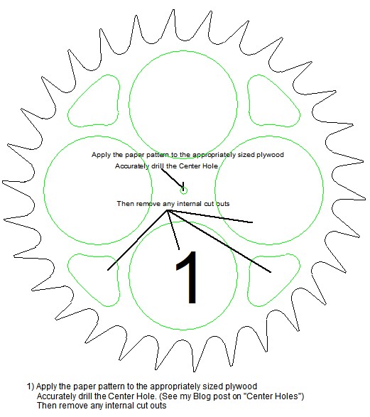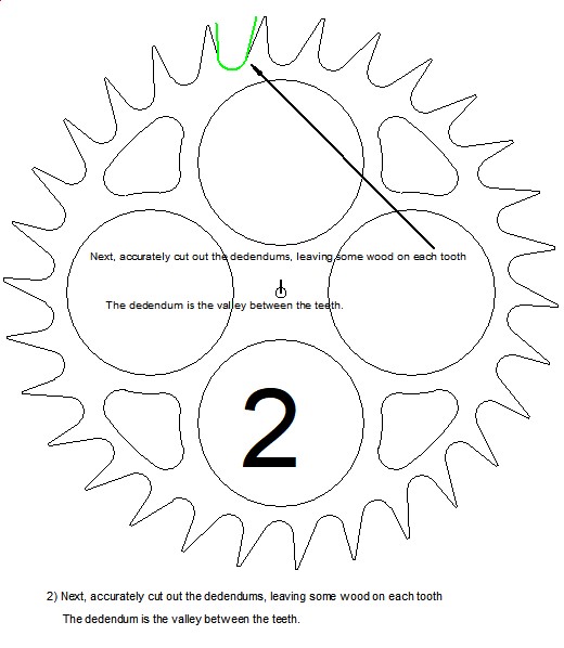 | More on cutting teeth… Tooth profile is a huge topic, and for each individual project it is also a choice. When I began making wooden clockworks I had a Craftsman scrollsaw (need I say more?). Every time I turned it on it would rattle the stuff off of shelves two rooms away. I'm lucky to still have teeth. So I avoided making tooth profiles that had to be cut on a scrollsaw. All of my early designs had teeth that are more easily cut on a band saw and then the space is expanded by sanding to the line on a 1" bench top belt sander. Thus I went with the more flattened tooth profile. Since I started in clockmaking with the band saw method, I actually prefer it. I find it faster and more accurate, and when I am making a prototype of a clock and need to cut gears fast, I usually go back to the square tooth profile. One note, however...I do always knock off that sharp little angle at the addendum of the tooth. In other words, I round over, ever so slightly, the ends of the tooth. The only reason I do that is because, early on, when I was less skilled at gear making, I would occasionally make a pair that would hit at the tip of the tooth (they are NEVER supposed to do that). And rounding over got rid of my problem. Now I do it out of superstition more than anything else. You can cut the teeth on Number 6 with a scrollsaw, or a hand saw, or whatever you'd like, but I find the band saw method worked best for me. When I drew Swoopy I started with the idea that I wanted NO straight lines in her design, which, of course, meant that the tooth profiles were to be "swoopy" also. Since then I have created many new clock designs and some have the swoopy, scrollsaw teeth, and the others have the square, band saw tooth profile. It's just a preference. Usually small and medium wheels go pretty fast on a scrollsaw, but large wheels are quickly done at the band saw. Large wheels may just be too difficult to maneuver at the scrollsaw. If your accuracy at the scrollsaw happens to be a bit lacking, here are four steps to help you create a wheel with a high degree of accuracy. I chose the escape wheel for this demonstration because the escape wheel has the most exacting requirements of any of the clock's wheels. However, these four steps can also be successfully applied when creating any of the clock's other wheels. The parts shown in green on each picture are the parts to be cut or sanded at that particular step.