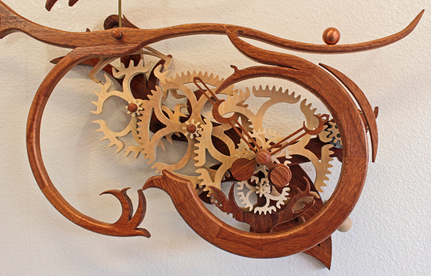 | The Organic can be wall mounted nearly anywhere because there are no long pendulums or dropping weights. The clock instead uses an onboard nine volt battery to operate the remontoir, or as you can see in the example below, the sculpture can be mounted to the organically shaped base to create a tabletop version. Both options are described in the plans. |